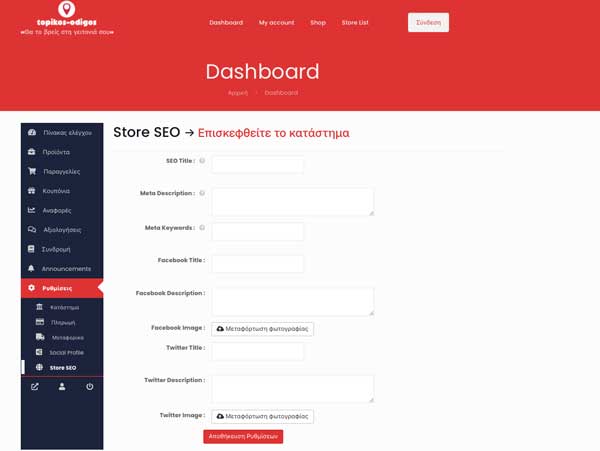 2. Ρυθμίσεις καταστήματος – Συμπλήρωσε πόσα προϊόντα θέλεις να φαίνονται στο κατάστημα ανά σελίδα, την Διεύθυνση σου, κατηγορία/ επάγγελμα & email, κλπ.